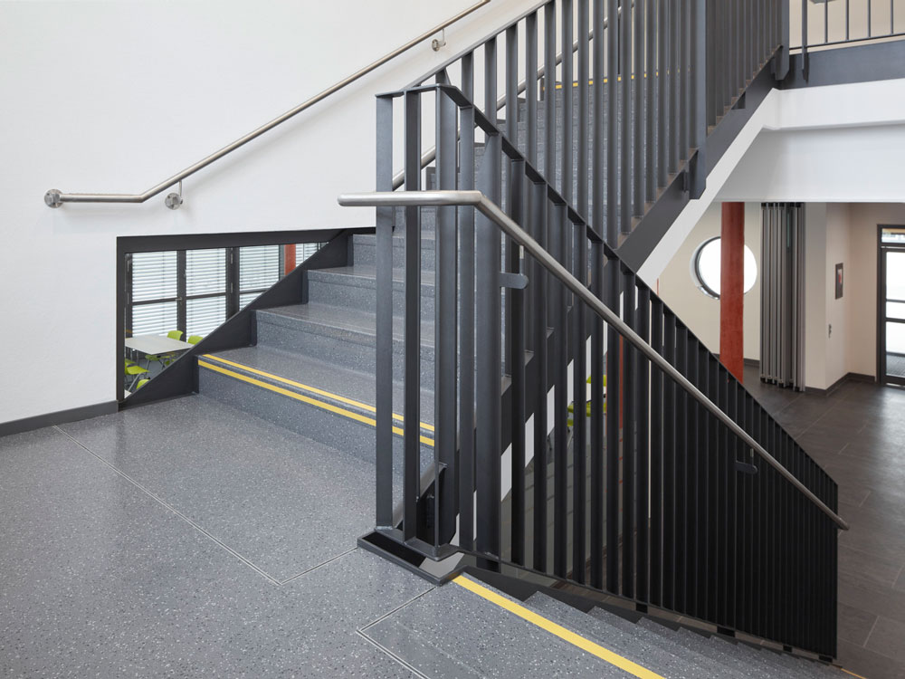 Een geïntegreerde signaalstreep is onderdeel van de trapvorm en biedt betere duurzaamheid en veiligheid dan een losse strip.